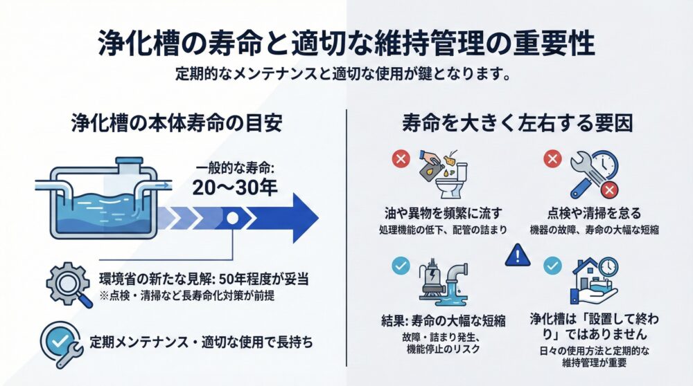 浄化槽は「設置して終わり」ではありません。日々の使用方法と定期的な維持管理が、寿命を大きく左右します。