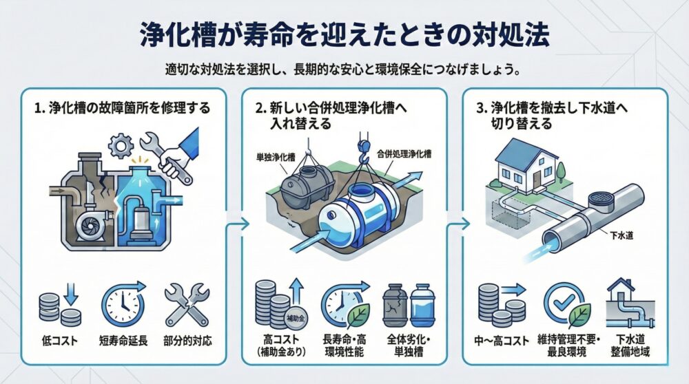 浄化槽が寿命を迎えたときの対処法について、以下の内容を解説します。