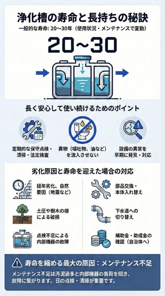 寿命を迎えた場合は、部品交換・本体の入れ替え・下水道への切り替えなど、状況に応じた対応が必要です。補助金や助成金が利用できる場合もあるため、事前に自治体へ確認しておくと安心です。