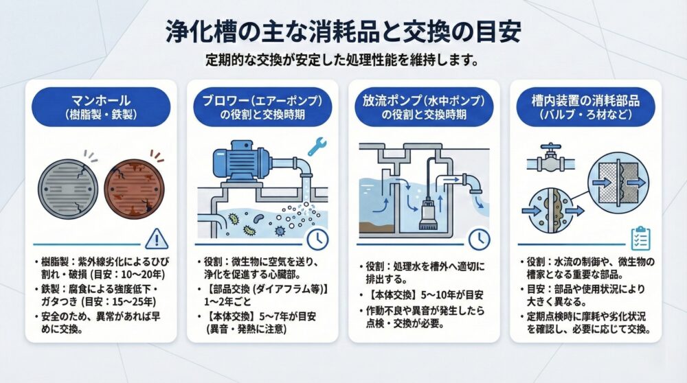 浄化槽の消耗品と交換の目安は、以下のとおりです。