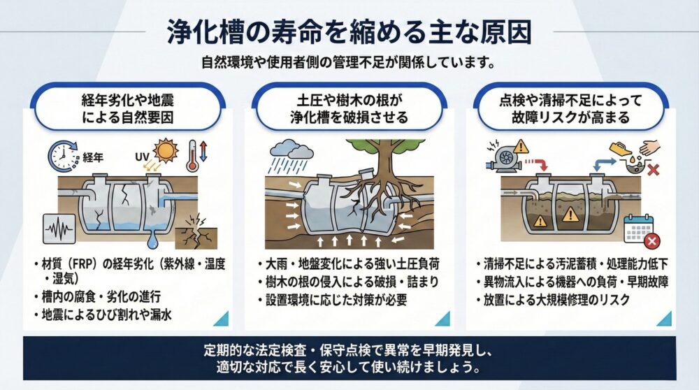 寿命を縮める原因には、自然環境や使用者側の管理不足が関係しています。浄化槽が劣化する主な原因は、以下のとおりです。