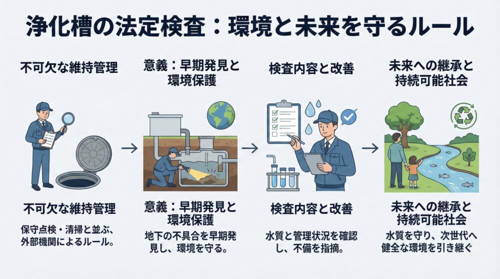 浄化槽は地下に設置されているため不具合が発生しても気づきにくく、発見が遅れやすいです。法定検査は環境保護の観点からも意義のある制度です。